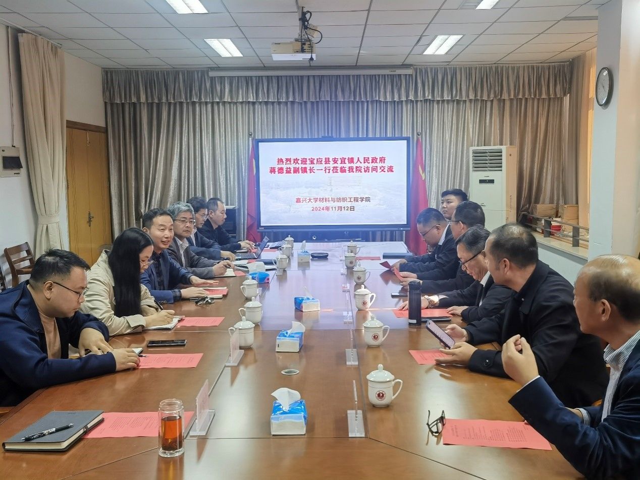 11月12日上午,江苏省宝应县安宜镇副镇长蒋德益、安宜镇社会治理办公室主任陶连国、安宜镇经济发展办公室主任陈军、海晟科技(浙江)有限公司总经理朱晓伟、浙江雅娜纺织有限公司办公室主任冯一波等一行6人到我院访问交流。学院举行了交流座谈会,会议由学院副院长(主持工作)沈加加主持,学院原院长易洪雷、优秀教师代表参加。