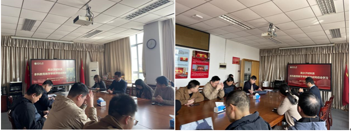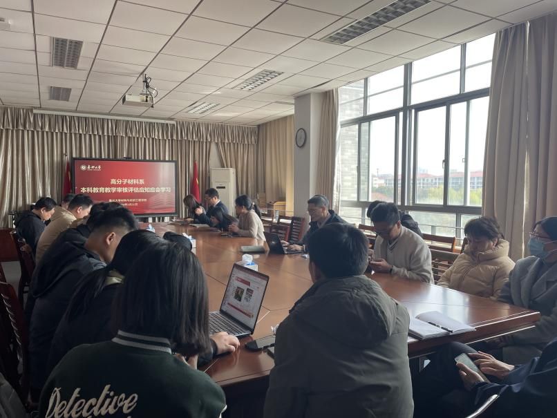 为广泛宣传评建工作的重要意义,普及本科教育教学审核评估的基础知识,3月21日学院高材系组织全系教师开展“本科教育教学审核评估”应知应会学习活动,学院副院长代正伟、高材系主任张葵花、系副主任沈小军和吴雯老师,以及高材全体教师参加本次活动。