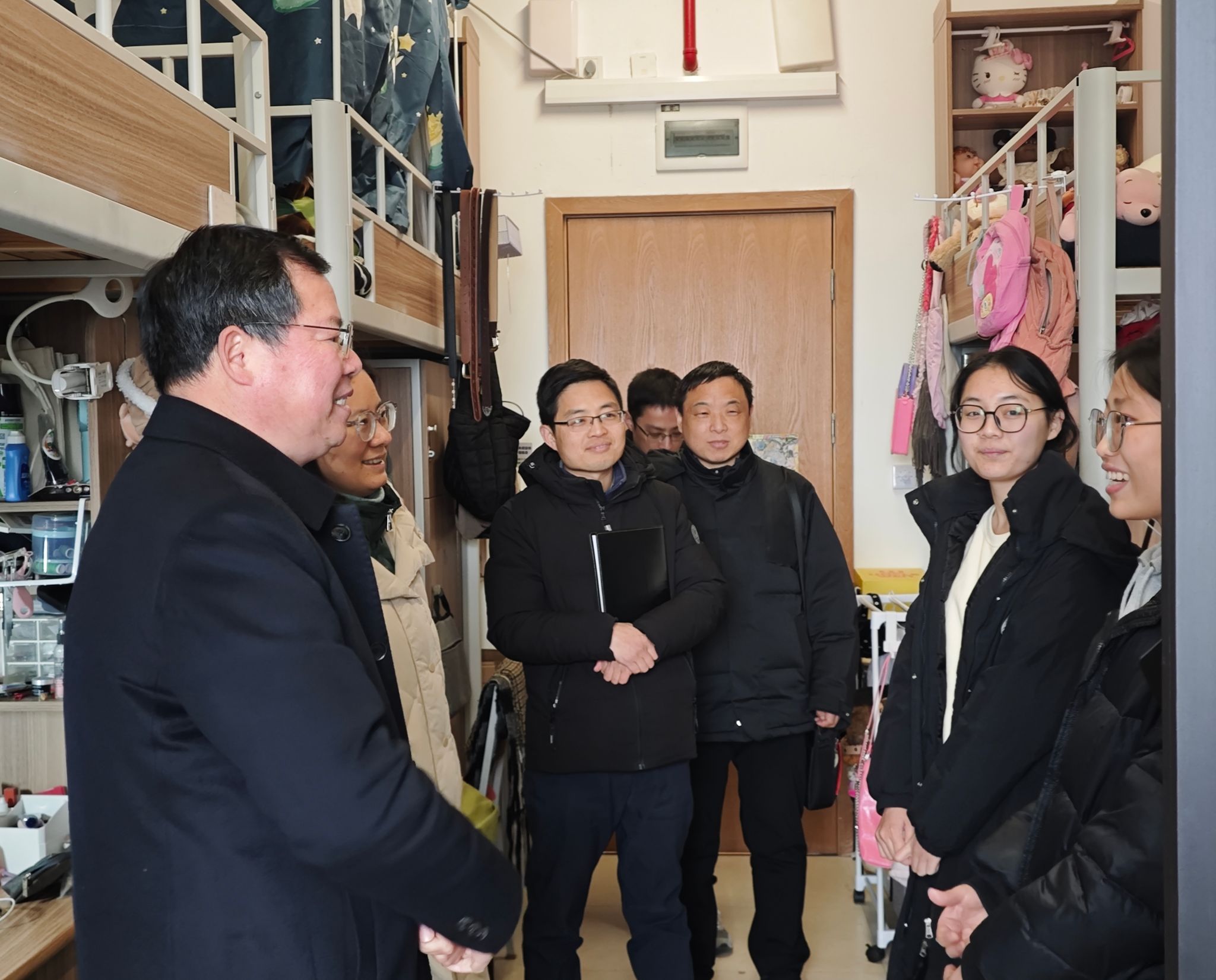 在本科学生宿舍,吴书记向同学们表达了学校的关心和问候,详细询问他们寒假期间的学习生活情况和开学报到情况,耐心询问大家目前就业工作进展、考研准备情况以及在生活上、工作上是否存在困难等,并给予相应的指导和建议。他亲切叮嘱同学们在新学期要及时调整状态,做好新学期的学习规划,建立和谐友好的人际关系,以积极的心态和良好的面貌迎接新学期的校园生活。
