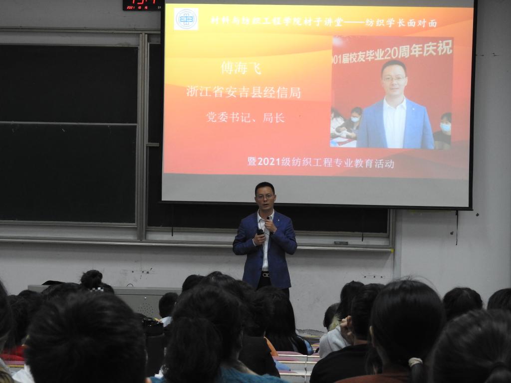 优秀校友代表纷纷为同学们传经送宝。浙江省安吉县经信局局长傅海飞介绍说纺织工程专业是一个传统且时尚的专业,这个专业与人们的衣食住行密不可分,是一个实用性非常高的专业。他教导同学们,做任何事情都要沉下心来,慢慢积累才能厚积薄发。浙江禾欣新材料有限公司部门经理徐一剡介绍了合成革制造过程、发展趋向以及相关领域。巨石集团品管部门经理朱琴峰分享了玻璃纤维的相关知识。海宁市经编工艺工作室主任陆新祥用幽默诙谐的方式介绍了经编的规模和销售情况。
