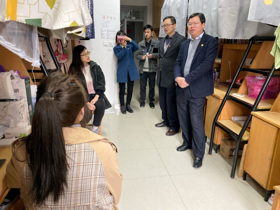 为促进学生健康成长,全面提高人才培养质量,2月28日下午,校党委副书记吴云达走访材纺学院学生寝室,材纺学院党委书记韩宝明,校党委办公室、材纺学院学工办相关工作人员随同走访。