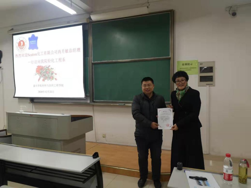 应我院轻化工程系邀请,英国SEATON化工有限公司肖月敏总经理、余飞经理一行于2020年12月22日下午访问了材纺学院轻化工程系,参观了轻化工程智慧实验室,并做客“嘉兴学院皮革讲堂”。轻化工程专业全体师生参加了讲座,讲座由轻化工程系主任罗建勋主持。