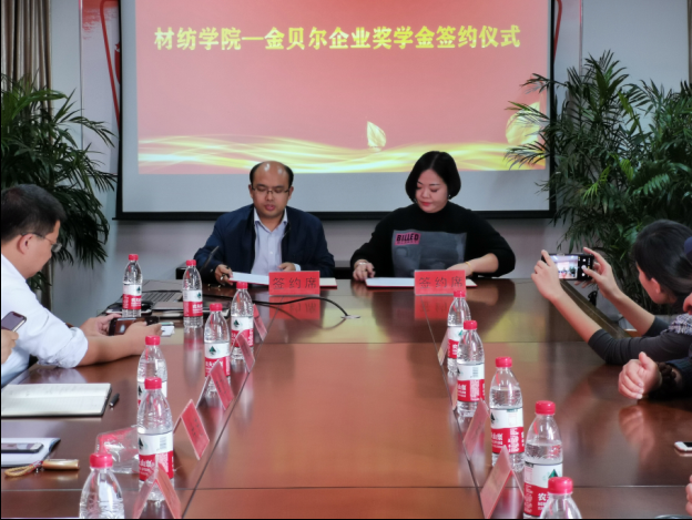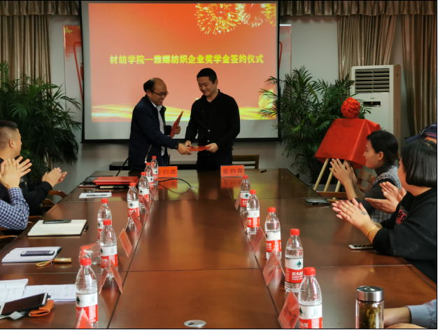 10月18日下午,在闻道楼419会议室举行2019年产学合作签约仪式。浙江雅娜纺织有限公司副总经理吴士奇一行2人,山东金贝尔贸易有限公司总经理周秀一行3人,嘉兴学院社会合作处副处长徐进,学院党政班子、教学系主任、教师代表参加了签约仪式。院党委副书记黄芳芳主持签约。