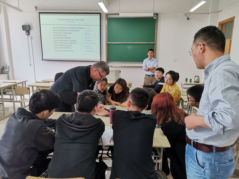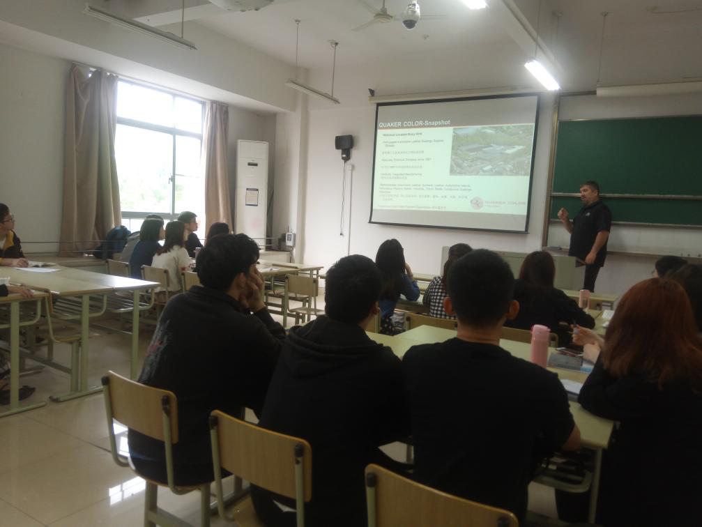 应我院轻化工程系的邀请,美国QUAKER COLOR公司的技术工程师James Withelder先生和杨欣先生于5月14日做客“嘉兴学院皮革讲堂”,为轻化工程专业学生做了“Basic Finishing Knowledge”及“皮革制造4.0”的学术报告,并进行了深入地交流。该报告围绕当前皮革的发展趋势、皮革涂饰的关键技术及皮革智能制造实现的条件等内容进行了精彩的讲解,开阔了本专业师生的视野,加深了对专业知识的理解。
