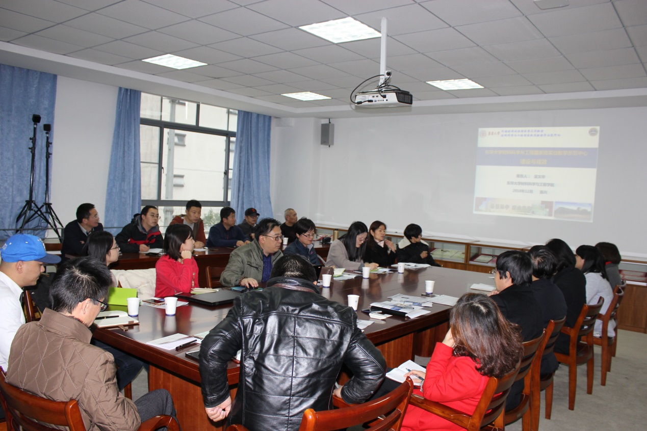 12月7日,东华大学材料科学与工程学院国家级实验教学示范中心常务副主任吴文华带领其中心6名成员来到材纺学院进行实验教学、管理和学科平台建设的学术交流活动。材纺学院黄立新副院长、李海东副院长、轻化工程系系主任罗建勋、实验中心主任程凤梅、学院部分教师及实验中心全体人员参加了报告会和交流活动。吴文华主任做了“国家级实验教学示范中心建设与成效”的精彩报告,并与参会人员进行了热烈交流。