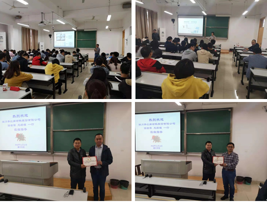 2018年11月13日,四川亭江新材料股份有限公司总经理任世军、技术研发部经理李靖博士、人力资源部胡经理一行来好色视频 轻化工程专业招聘及交流。首先罗建勋主任代表轻化工程专业向任世军总经理、李靖博士颁发校外兼职教师聘书;随后,李靖博士为轻化工程专业全体师生做了主题为“无铬鞣研究最新进展——从研发到应用”的精彩报告,报告内容反映了数年来公司在新型无铬鞣剂研发方面的巨大投入及研发人员的辛勤付出;胡经理围绕公司的发展历程、薪资福利及人才培养需求等方面进行了细致讲解,会后及时了解了学生对工作的期望,并对轻化工程专业的部分学生进行了面试。