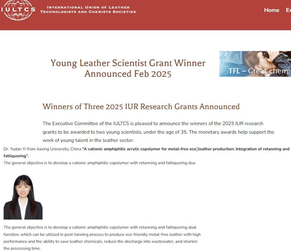 3月3日,IULTCS(国际皮革工艺师和化学家协会联合会)执行委员会宣布,2025年IUR研究资助将授予两位青年皮革科学家(<35岁),其中一位为来自我院轻化工程专业的易玉丹博士。该项基金奖励旨在助力并支持皮革行业年轻人才的科研工作。
