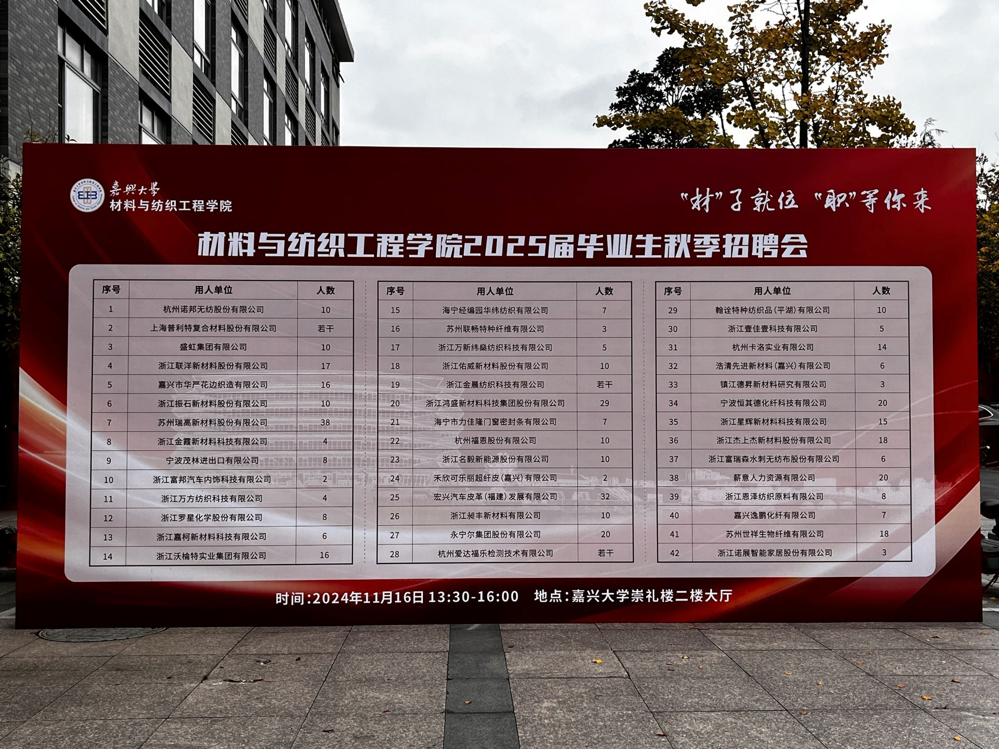 为贯彻落实党中央、国务院“稳就业”“保就业”决策部署,努力实现我院2025届毕业生早就业、就好业,11月16日下午,材纺学院在崇礼楼二楼大厅举办“材子就位 职等你来——2025届毕业生秋季招聘会”。