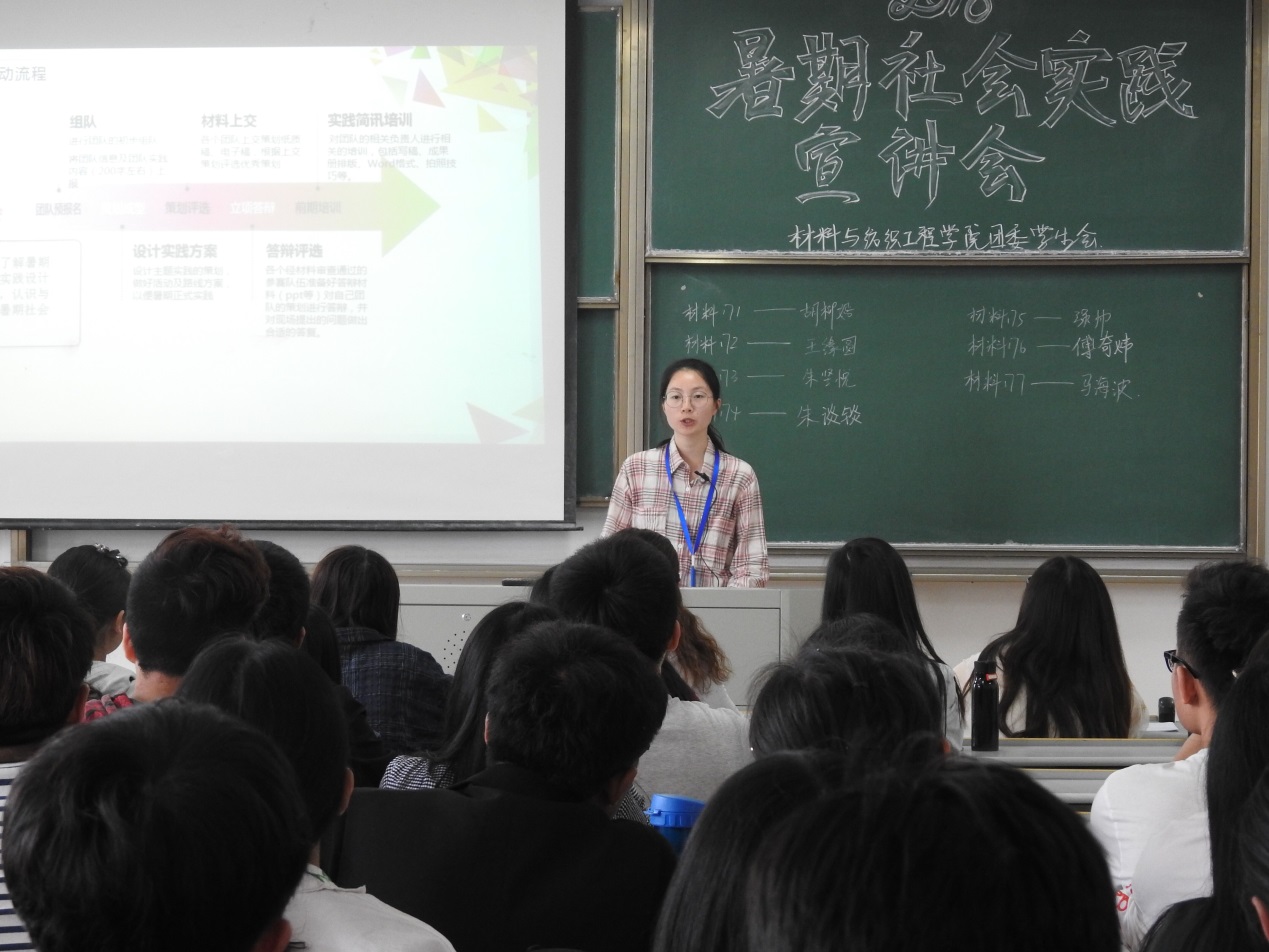 4月27日中午12:20,好色视频 团委召集材料类17级各班班委在十号楼402教室举行了“以实践之名 伴‘材’子之行”为主题的2018年暑期社会实践策划设计大赛宣讲会。学院团委副书记刘洋老师、2017年暑期社会实践校级“十佳团队”代表刘娜同学及“优秀团队”代表桑婧婧同学出席了本次宣讲会,向学弟学妹们传授经验。
