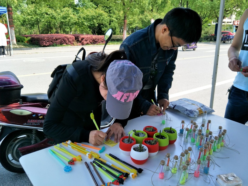 4月22日,天气晴朗,春风洋溢,校园里充满着自由蓬勃的青春气息。材纺学院心理中心的3名工作人员早在8点开始,在老食堂布置活动现场,精美的伞棚装饰,配上炫彩的漂流瓶和明信片,处处体现了活动的丰富性和多趣性。