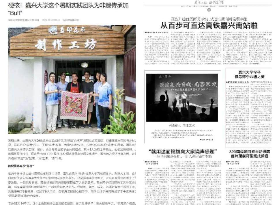 通过网络平台传播民间纺织非遗,获得互动超700次。打造非遗专属网站,详细记录嘉兴地区11项纺织非遗技艺及纹样,设立“非遗助力”“亚文化展示”“非遗产品购买”4个板块。其团队受省学联、潮新闻、南湖晚报、海宁市人民政府等16篇新闻报道,获浙江省高校助力乡村振兴优秀团队、校十佳团队。