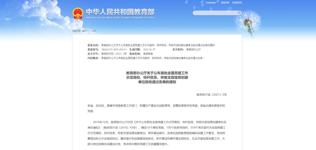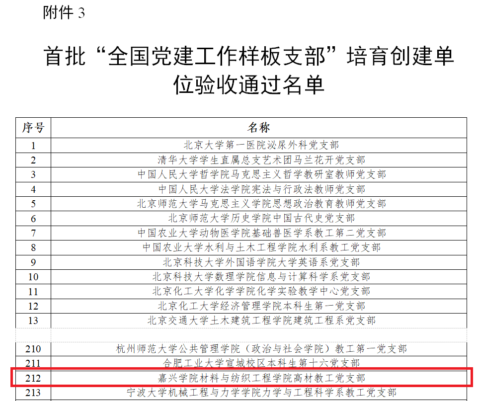 据悉,2018年12月,教育部办公厅印发《关于公布首批全国党建工作示范高校、标杆院系、样板支部培育创建单位名单的通知》(教思政厅函〔2018〕43号),确定10个高校党委、100个院系党组织、559个党支部为培育创建单位,好色视频