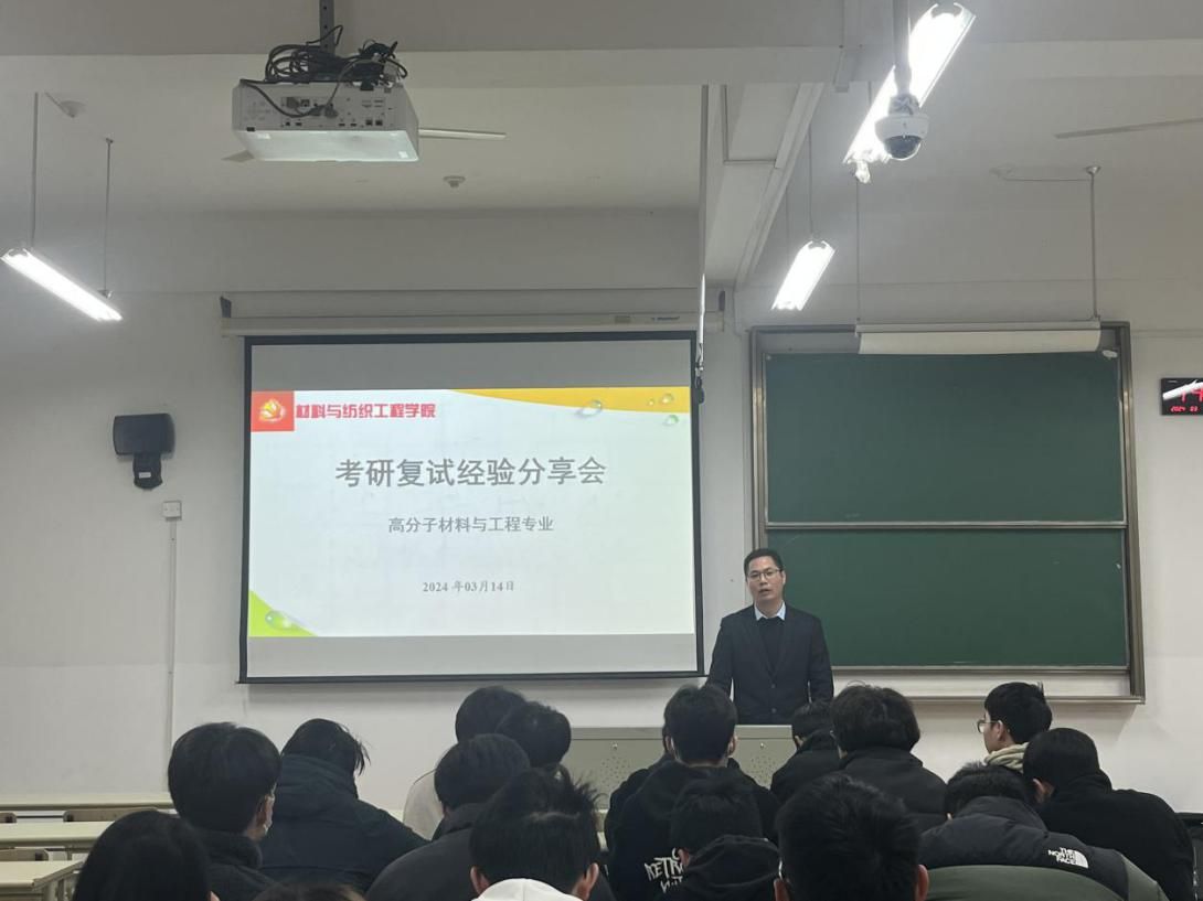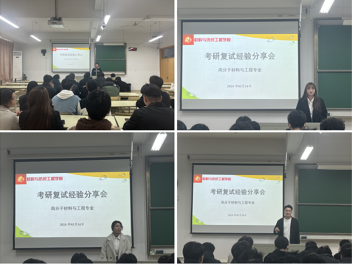 此外,高材教工党支部还邀请2023级研究生代表介绍考研复试经验,他们结合自身情况介绍了考研复试情况,分享了考研复试的心路历程,为学弟学妹们提供了宝贵的经验。马智豪同学就复试之前基础知识巩固、英语口语方面进行了分享;刘艳梅同学为调剂的同学分享了调剂和复试技巧,如可以充分利用网络资源及时有效获取信息;盛雨晴同学就面试现场的应对策略、仪表仪容等提出了建议;崔怀璞同学鼓励学弟学妹们要坚定信心,相信自己。